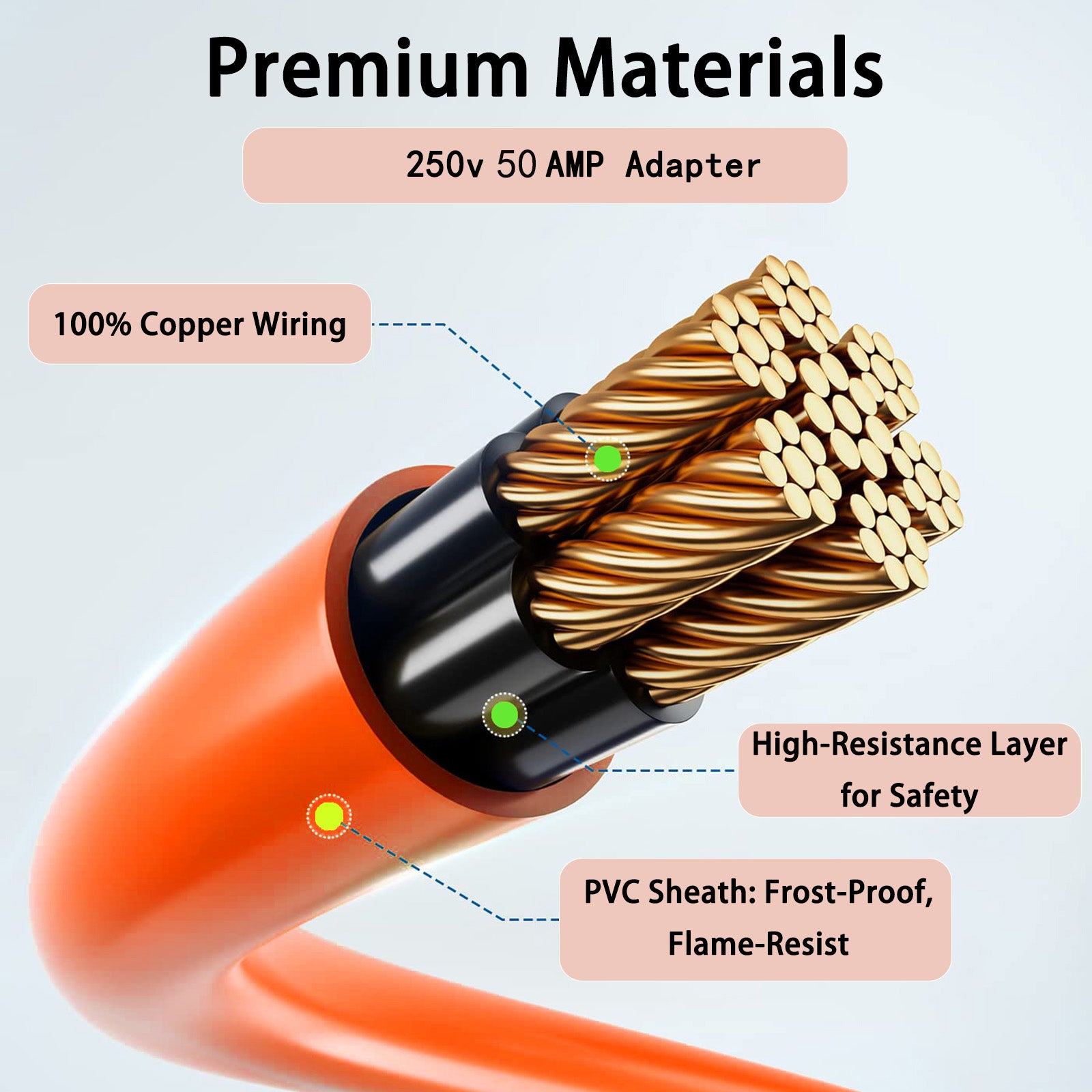 【Excellent Quality】 The plugs, pins, and terminals of the NEMA 14-50 splitter utilize advanced electroplating technology on oxygen-free copper, effectively preventing surface oxidation and rust. The exceptional copper core offers minimal resistance, enhancing efficiency while significantly reducing heat loss. The outer casing is made from high-quality, environmentally friendly, flame-retardant rubber, ensuring strength, durability, and safety.