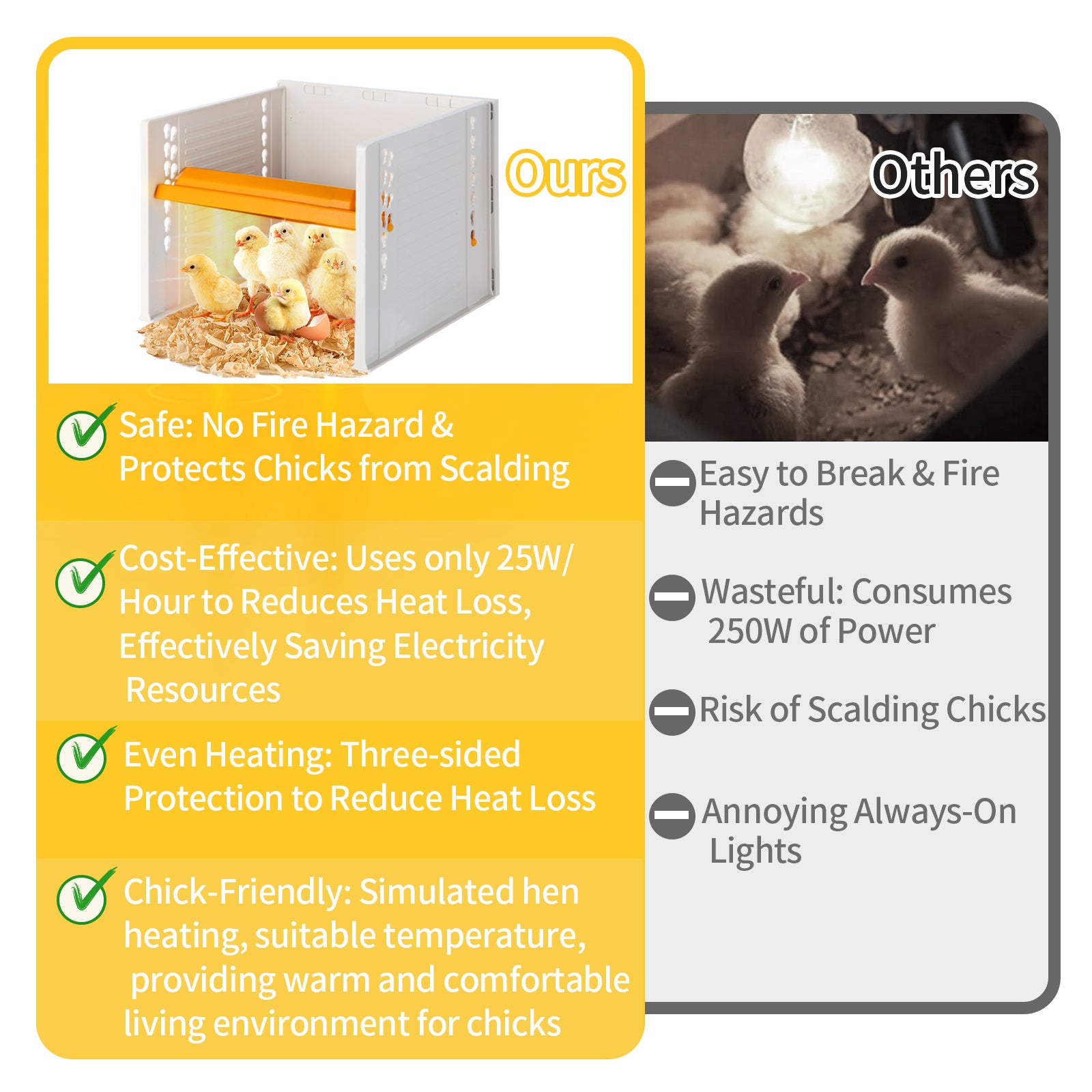 - 【Temperature control at will, low power consumption, uniform heating】 Compared to unobstructed ventilation on all sides, which results in over 60 degrees of heat and lower safety for chicks, our product offers three-sided protection to reduce heat loss. This, combined with the concept of chick rearing, enhances the safety feeling for chicks. Compared to heating lamps, which have high power consumption and temperature, our product reduces heat loss, effectively saving electricity resources.
