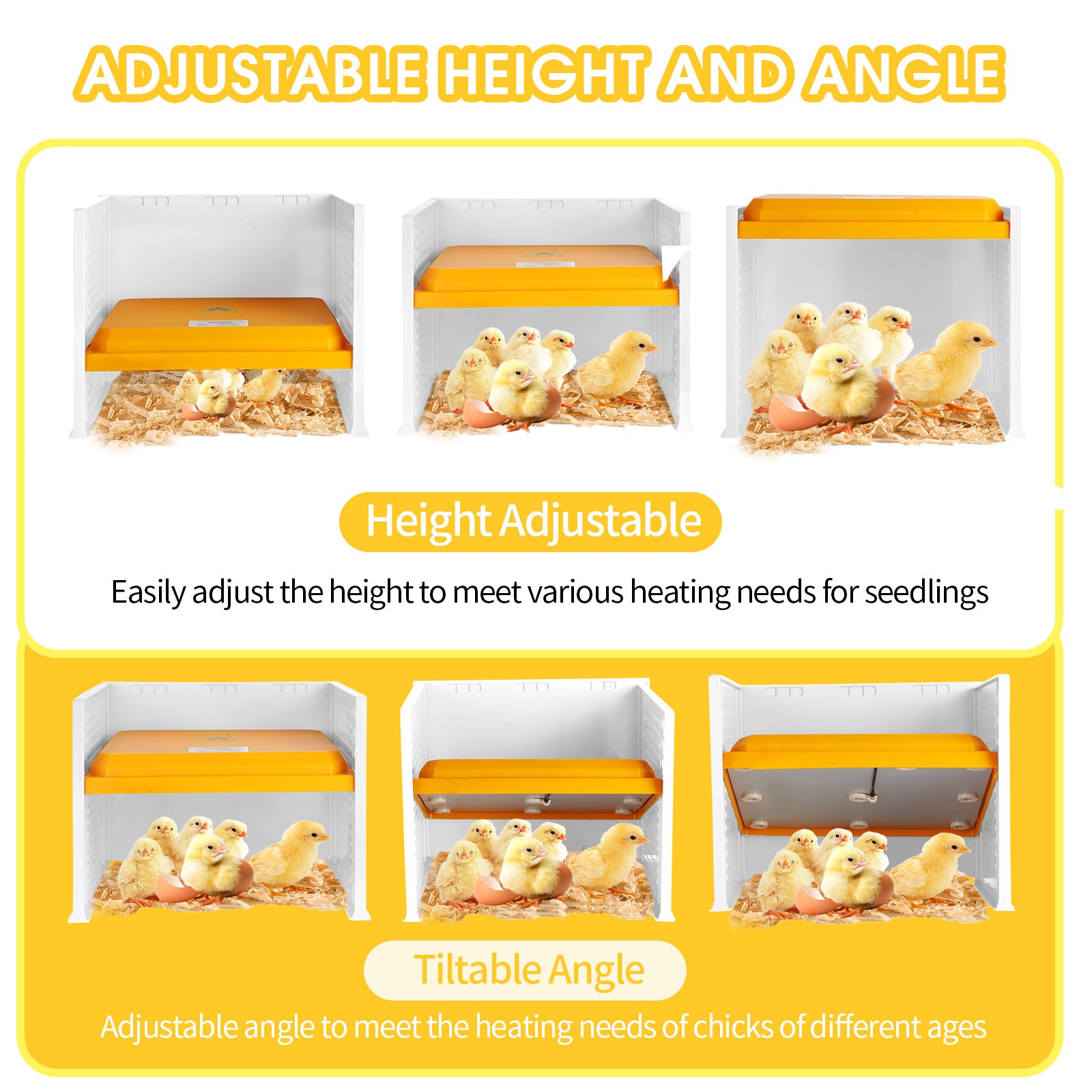 - 【ADJUSTABLE HEIGHT AND ANGLE】 Provide optimal comfort for your chicks with our adjustable chick heating plate. Easily customize the warmth by adjusting the height and tilt angle to suit your adorable chicks. See them cozy up to the perfect spot, whether it's in the front or back.