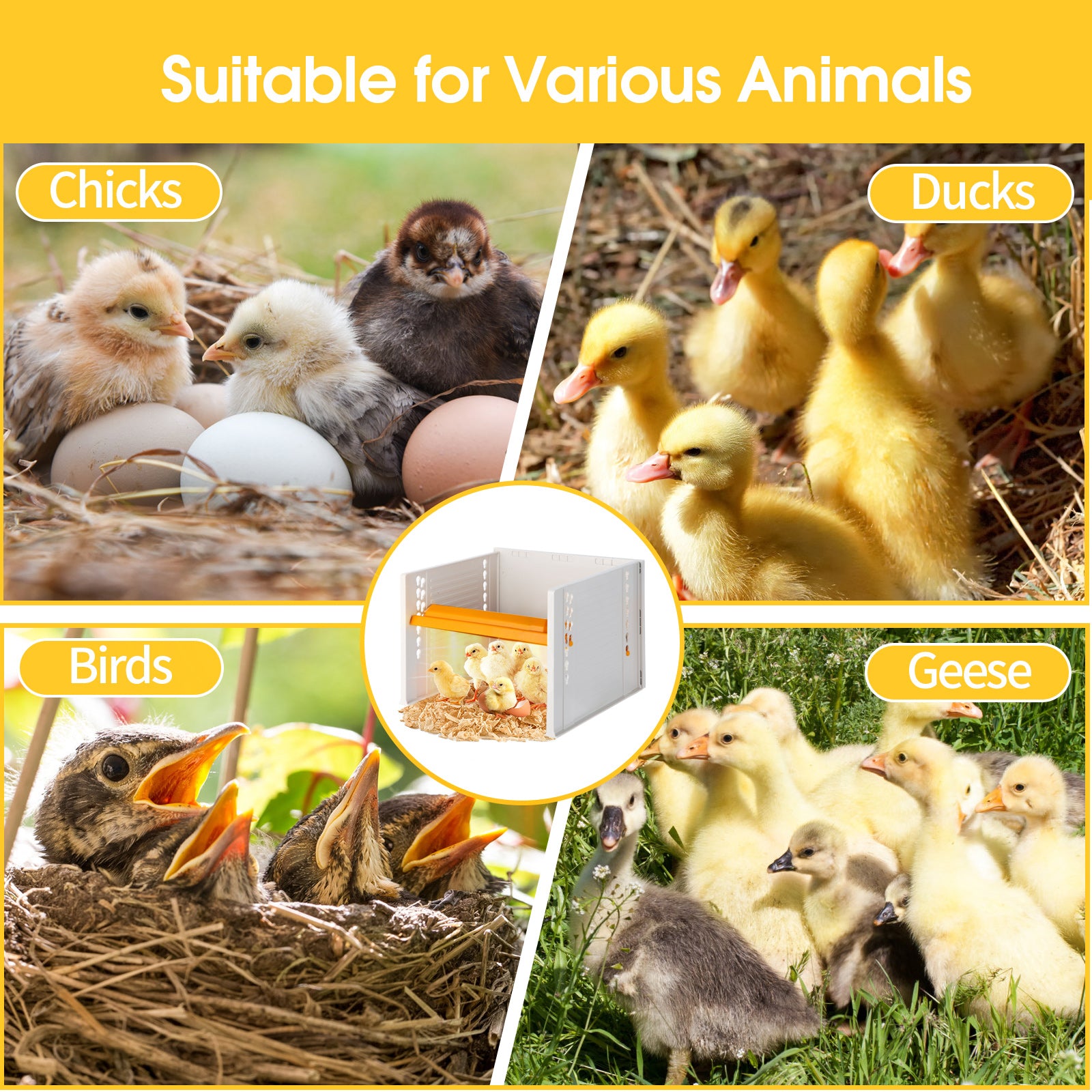 - 【 Versatile for small-scale poultry species】 Our brooder heater is designed for multiple poultry species, including ducklings, birds, quail, and more, offering a flexible solution for various brooder setups and poultry habitats.