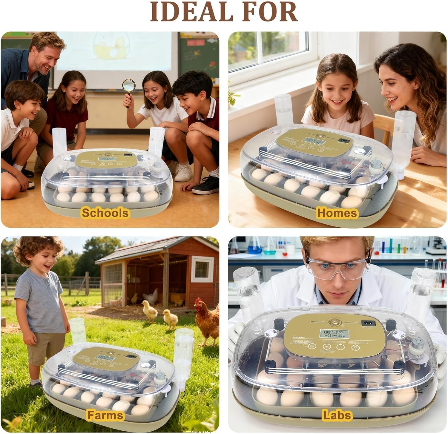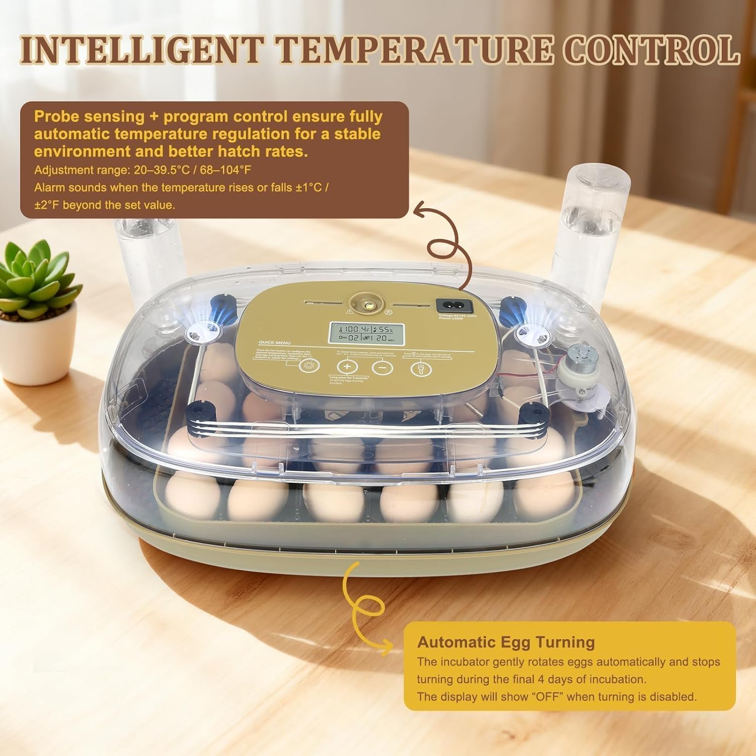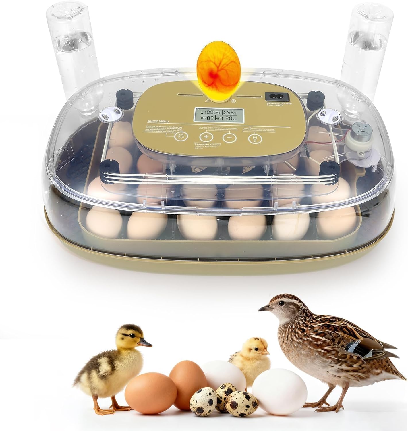 • Track temperature, humidity, incubation days, and egg-turning progress on a clear display. Built-in alarms, candling, and a transparent 360° panoramic view allow easy monitoring without opening the lid.