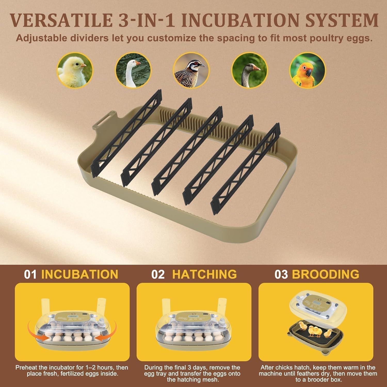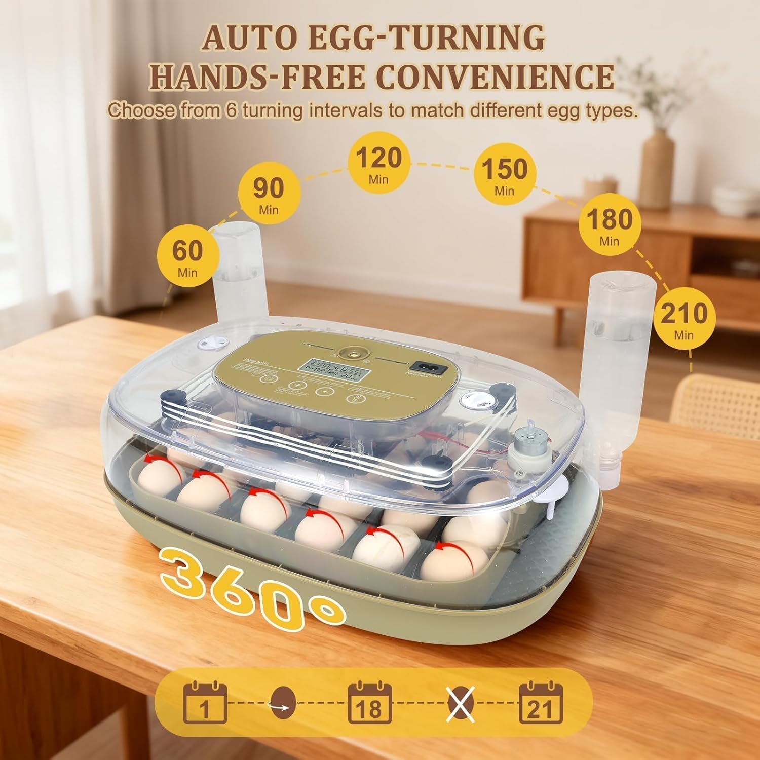 • Stage-based humidity and stable temperature are automatically maintained. Adjustable egg turning intervals (60/90/120/150/210 minutes) mimic a mother hen for a natural hatching process, allowing more precise control throughout incubation.
